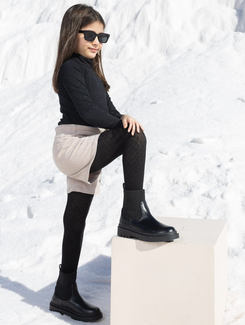 Optez pour ces bottines pour filles bi-matière en similicuir lisse sur la partie basse, et effet chaussette sur la partie haute jusqu’au dessus de la cheville. Sa semelle épaisse et talonnée, elle s’enfile très facilement.