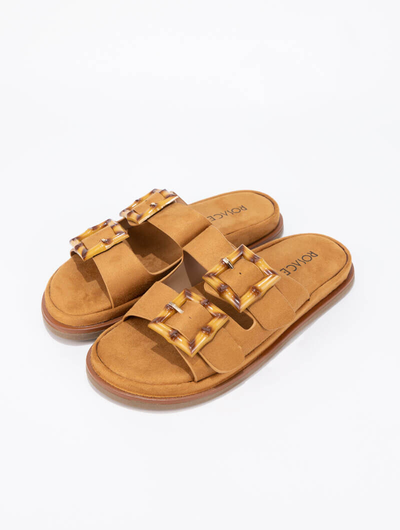 Ces mules à boucles apportent une touche sophistiquée à toutes vos tenues. Leur silhouette épurée et leur boucle métallique élégante en font un modèle parfait pour un look à la fois décontracté et raffiné.