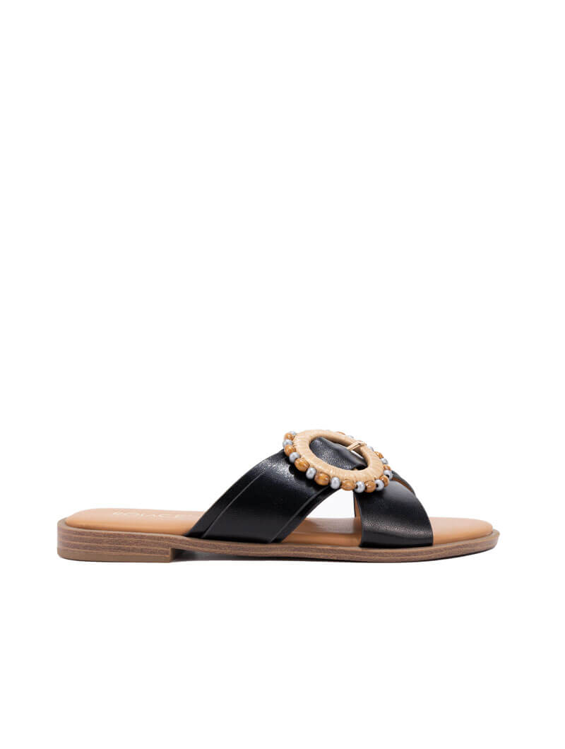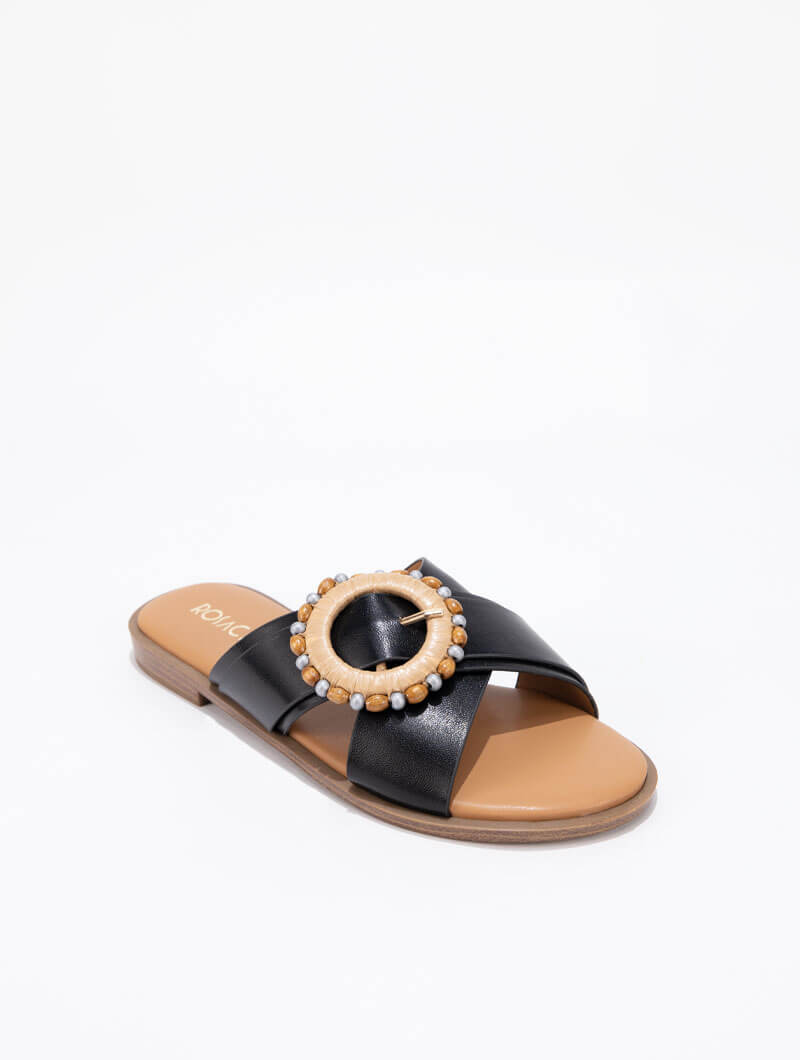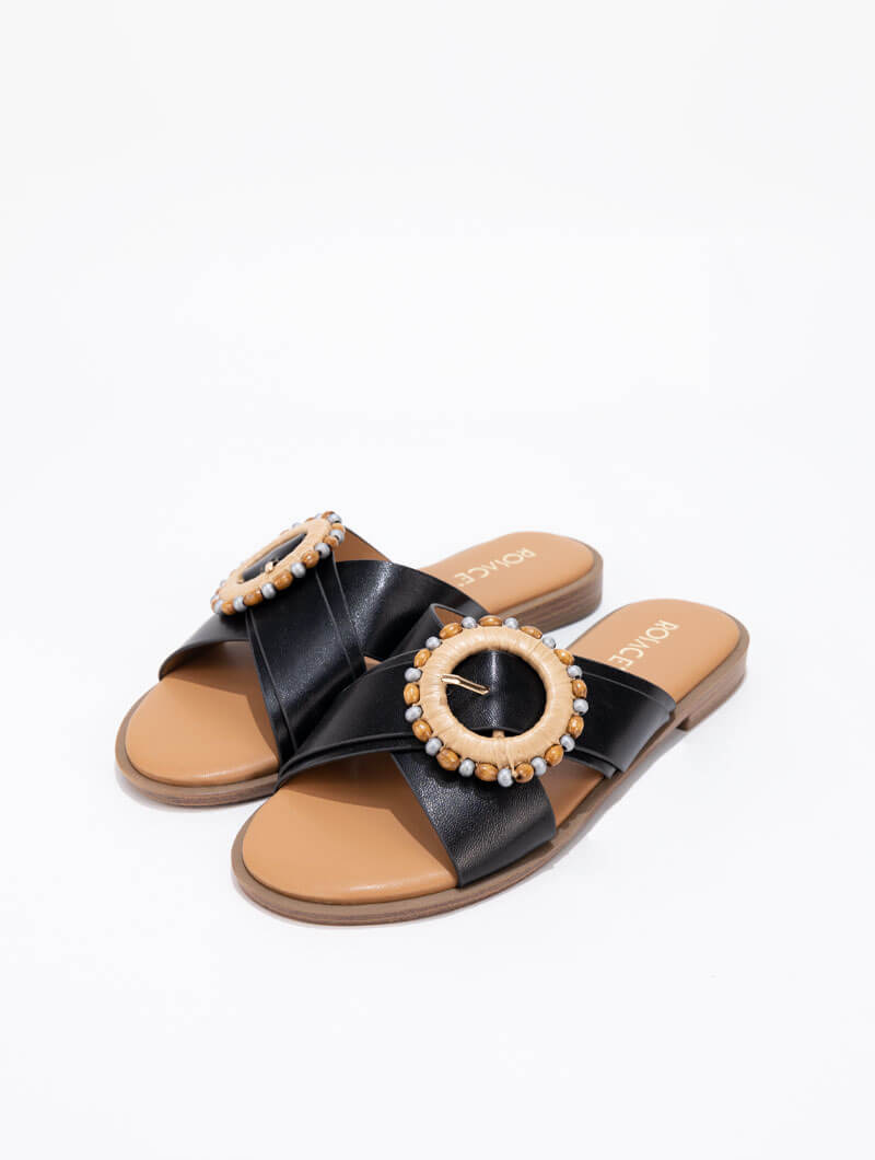 Mules plates à brides croisées, sublimées par une boucle décorative entourée de perles. Un modèle à la fois confortable et raffiné, idéal pour ajouter une touche d’élégance à vos looks d’été.