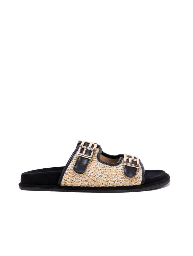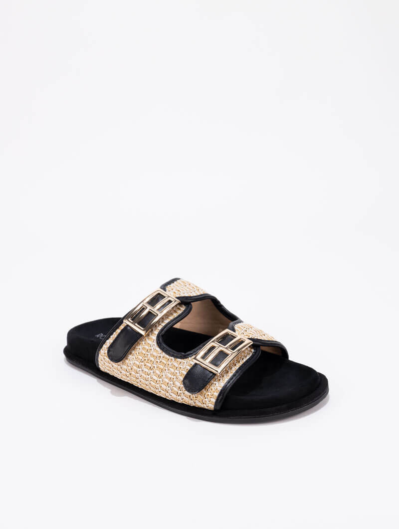 Ces mules plates à double bride se distinguent par leurs boucles scintillantes ornées de strass. Alliant confort et praticité, elles apportent une note lumineuse à vos tenues de tous les jours.