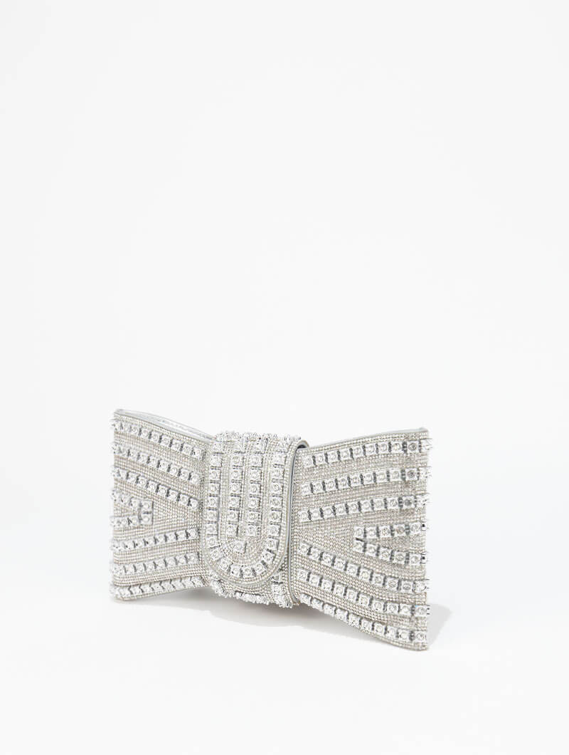 Ce sac de soirée à nœud en strass apporte une touche de brillance et de raffinement à vos tenues. Son design chic et son détail lumineux en font l’accessoire idéal pour sublimer vos looks lors d’occasions spéciales et d’événements.