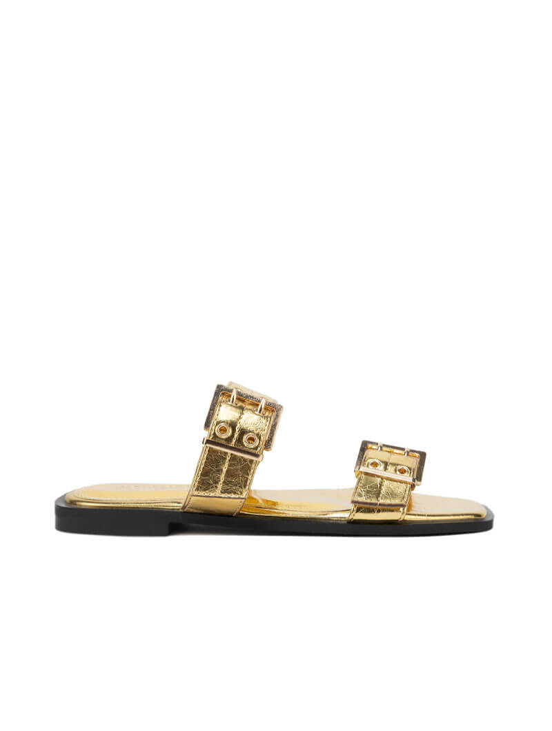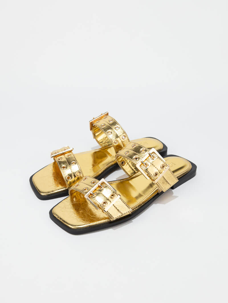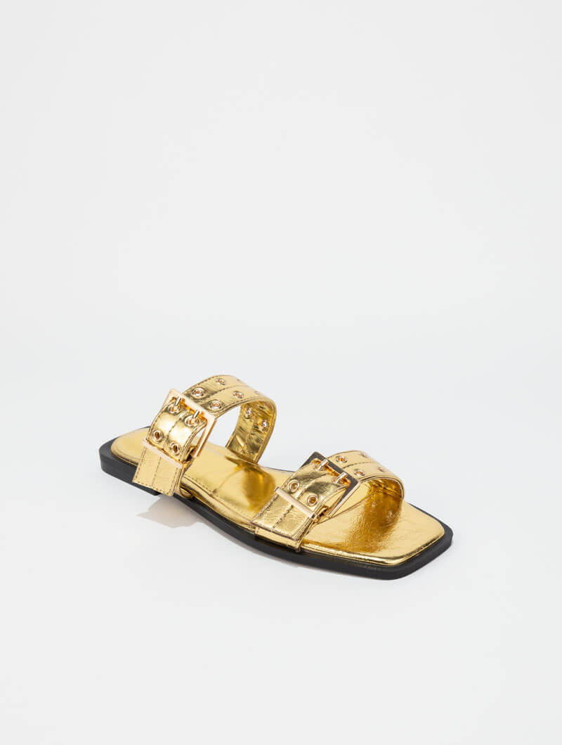 Mules à double brides métallisées , un modèle élégant et moderne qui se distingue par ses deux brides ajustables et ses finitions à effet métallique, apportant une touche chic et lumineuse à vos looks d’été.