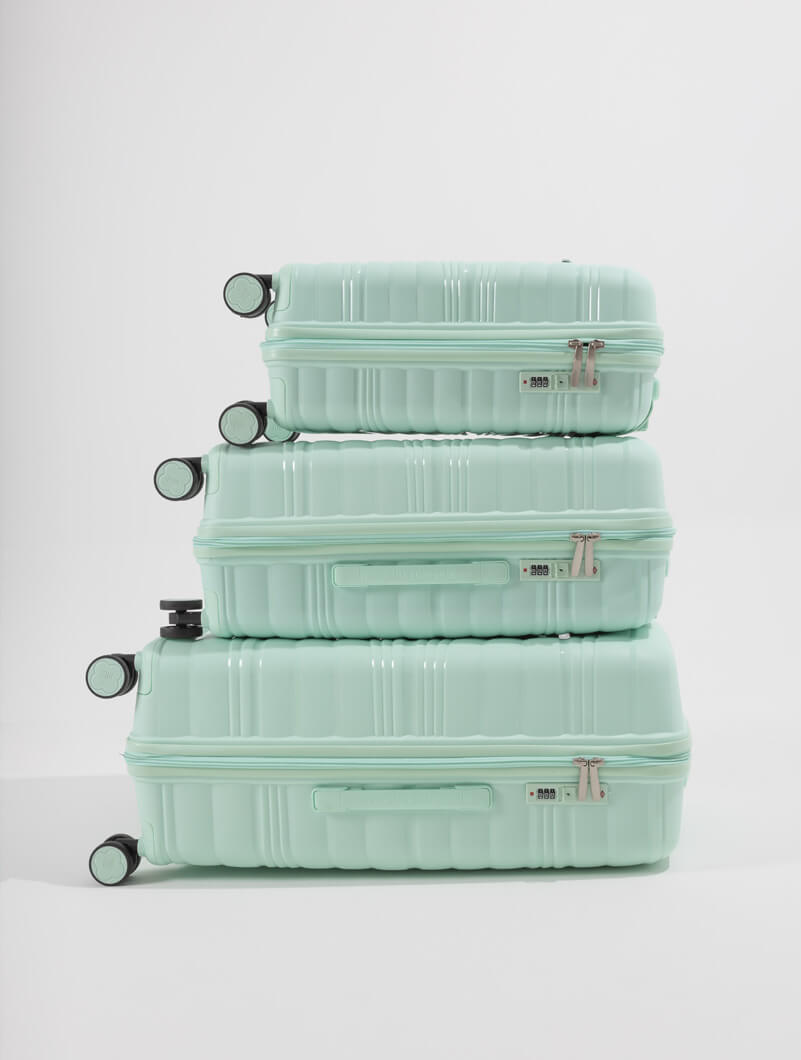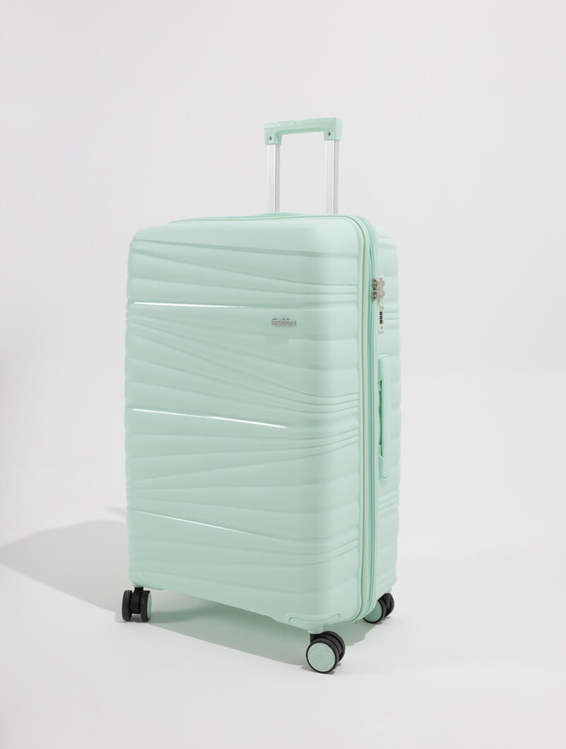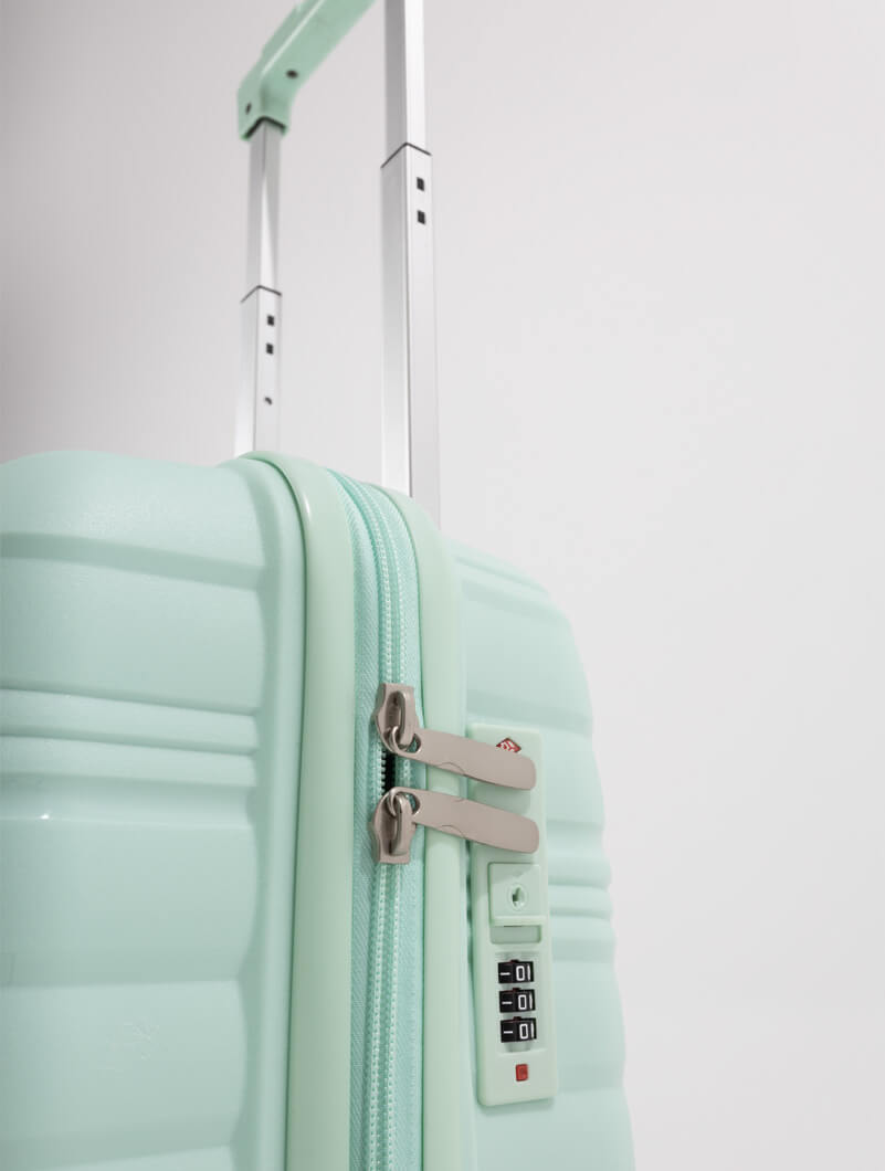 Valise incassable, légère et durable en polypropylène moyenne taille. La Valise a 4 roues rigides et pivotantes à 360° avec mot de passe et une poignée rétractable à boutons.