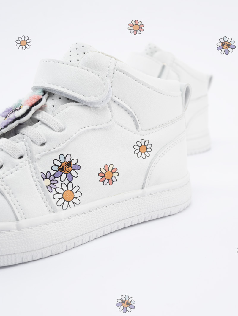Baskets montantes avec design des fleurs et décorées avec des stickers sur les lacets, ces baskets misent sur un style actuel qui plaît aux filles, très rapides à enfiler grâce à leur fermeture à scratch.