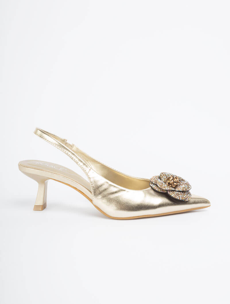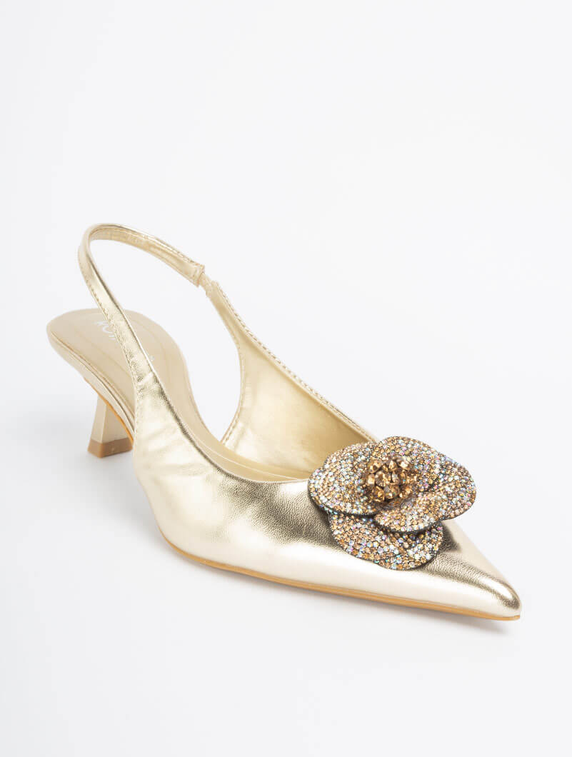 Complétez vos tenues de soirée avec ces escarpins métalliques, dotés d'une élégante boucle à fleur en strass et d'une bride arrière qui permet d'enfiler facilement la paire et de maintenir joliment le pied.