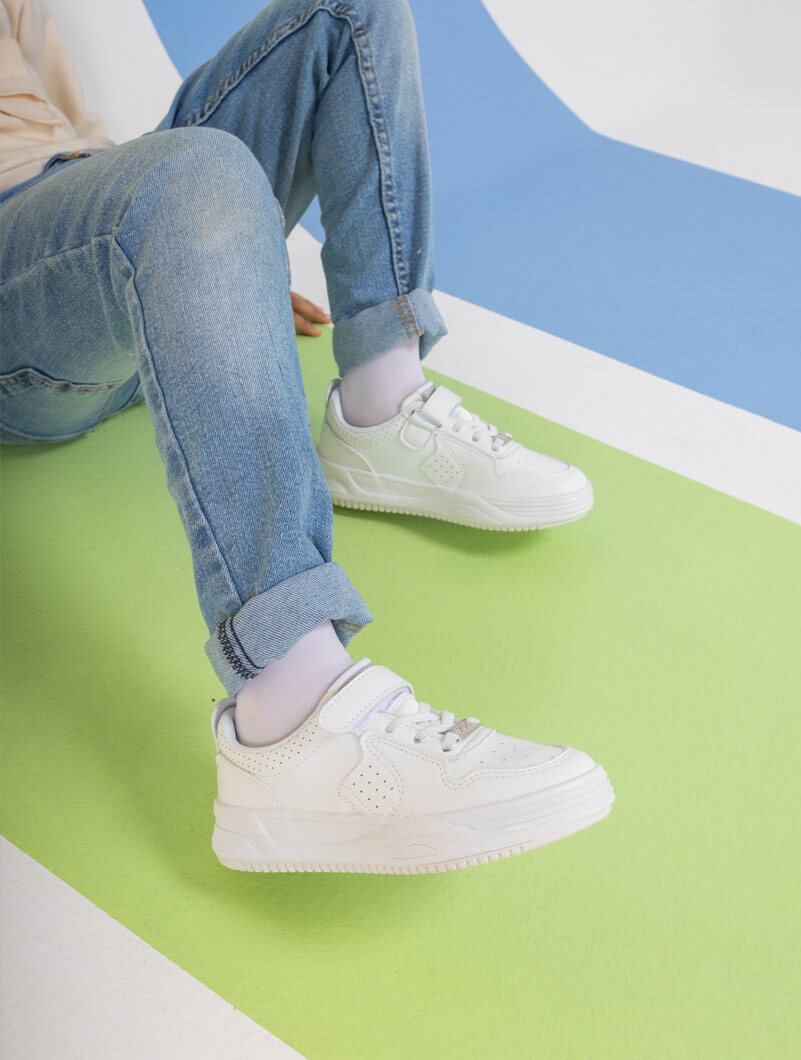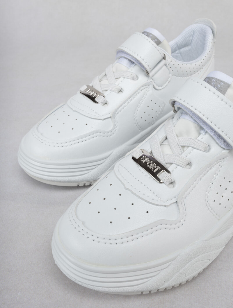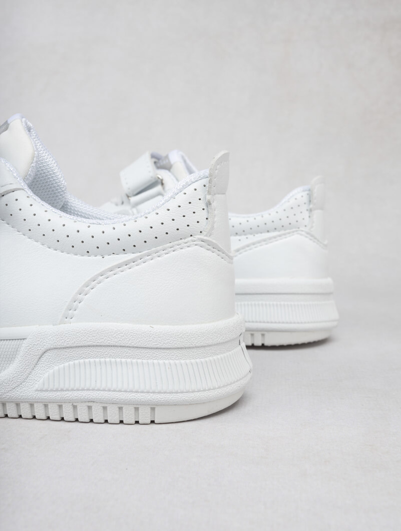 Baskets blanches pour enfants, idéales pour l'école et les jeux de plein air, avec un design à scratch facile à utiliser.