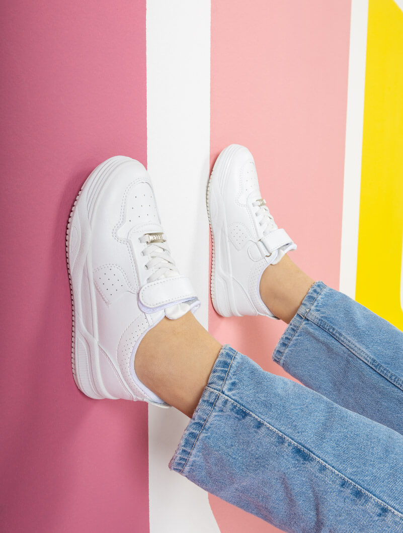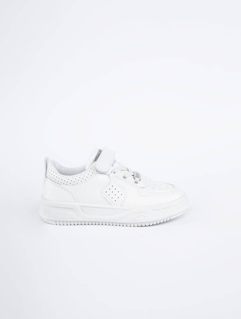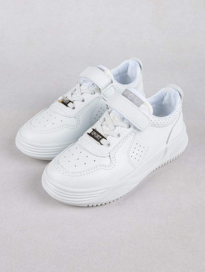 Baskets blanches pour enfants, idéales pour l'école et les jeux de plein air, avec un design à scratch facile à utiliser.