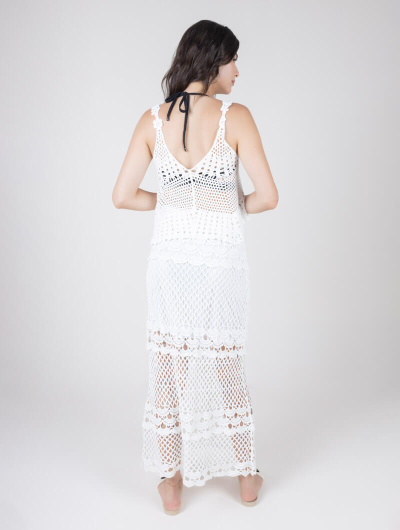 Adoptez un look bohème chic avec cet ensemble en crochet. Le haut court, orné de motifs délicats, et la jupe longue vous donnent une allure romantique et élégante. Parfait pour les journées ensoleillées et les festivals estivaux, cet ensemble est une véritable ode à la mode artisanale.