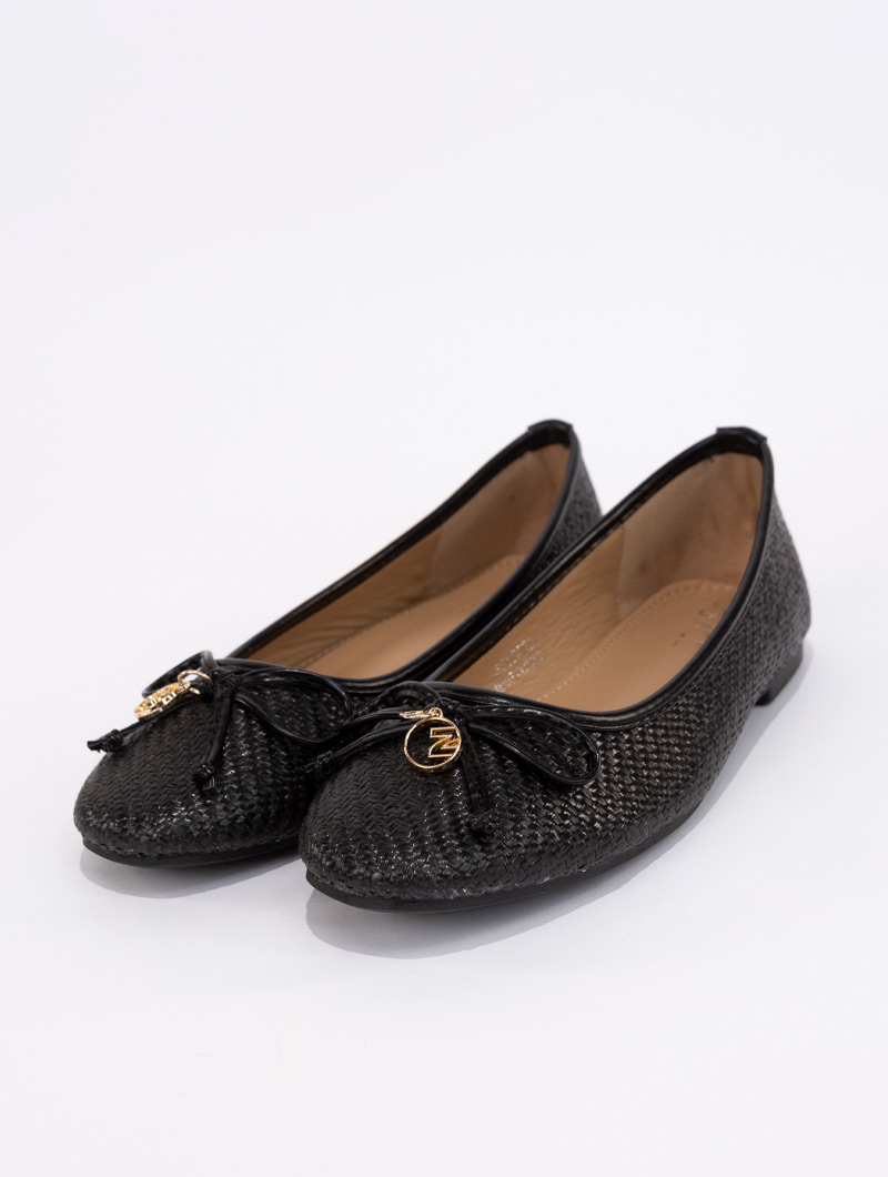 Ballerine plat, ornée d'une élégante boucle décorative et dotée d'une semelle intérieure confortable pour un confort optimal tout au long de la journée.