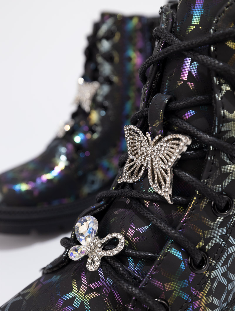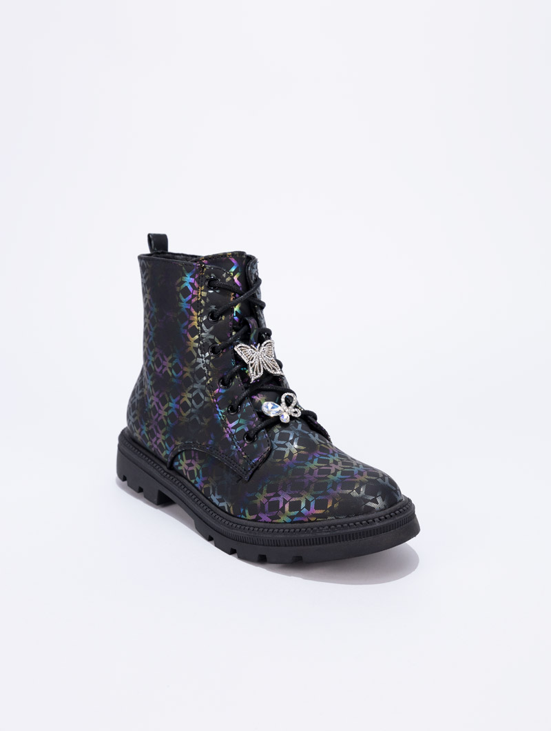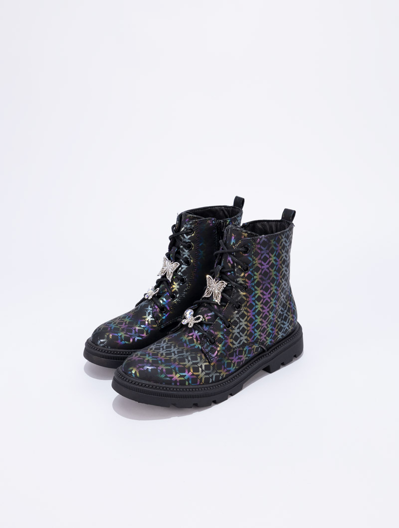 Ces bottines pour enfants sont un véritable mélange de fantaisie et de couleurs. Elles sont agrémentées de détails accessoires sur les lacets, apportant une touche originale et unique. Parfaites pour compléter les looks automne-hiver de votre fille, alliant confort, style et éclat.