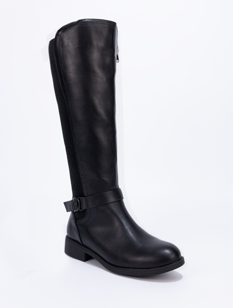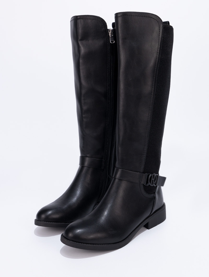 Bottes hautes à bout rond pour femmes en similicuir lisse, avec côtés élastiques et boucle décorative, alliant confort et style tendance.