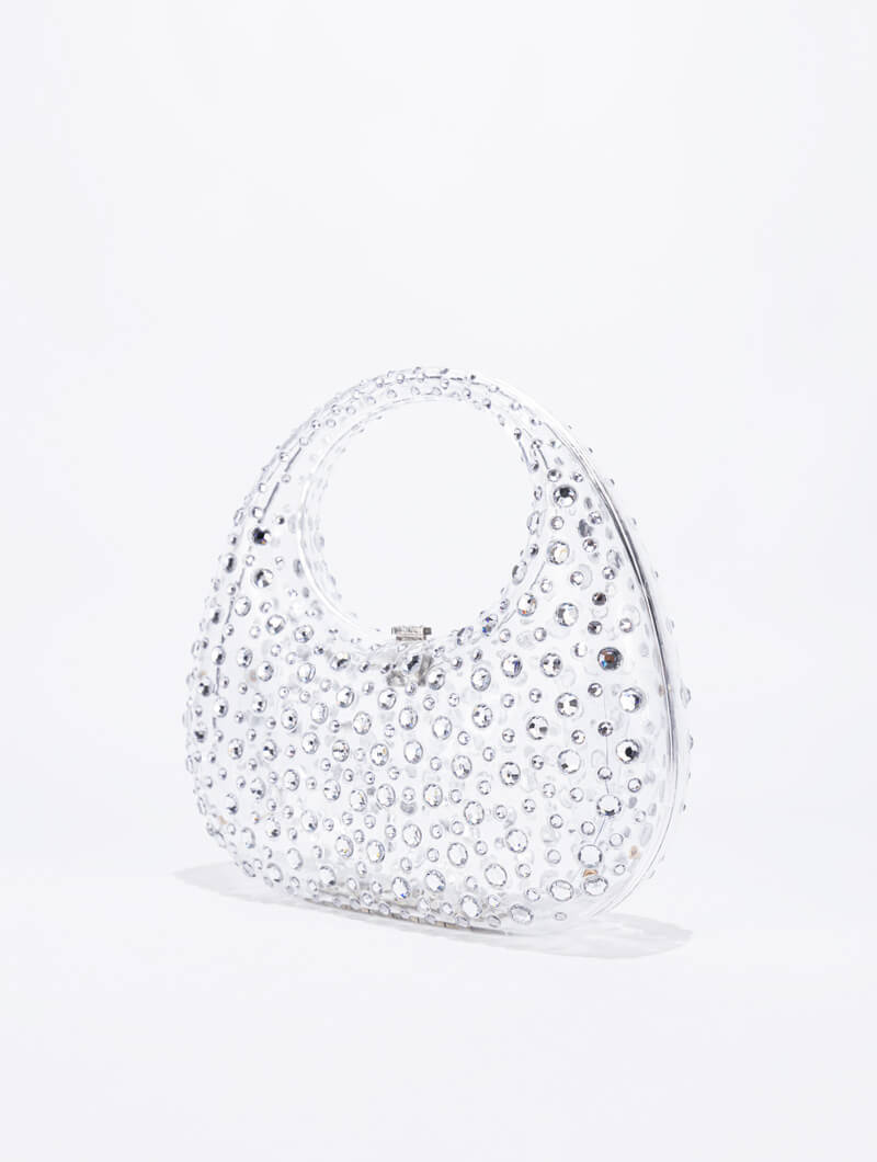 Sac de soirée transparent orné de strass scintillants. Un design audacieux qui mêle transparence chic et éclat raffiné, idéal pour vos soirées élégantes.