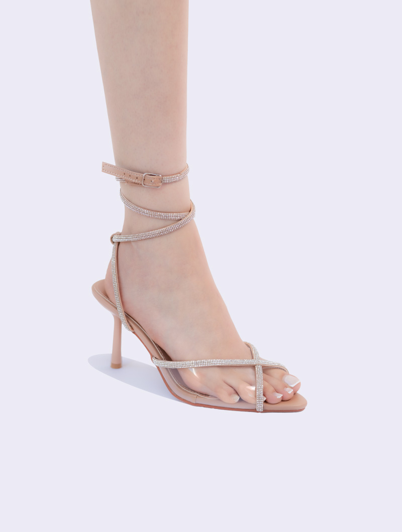 Élégance et modernité réunies dans cette paire de sandales à talons. Conçues pour sublimer vos tenues de soirée, ces sandales nude présentent des brides fines ornées de strass étincelants et une touche de transparence tendance. Leur design délicat met en valeur la silhouette tout en assurant un bon maintien grâce à la bride cheville.