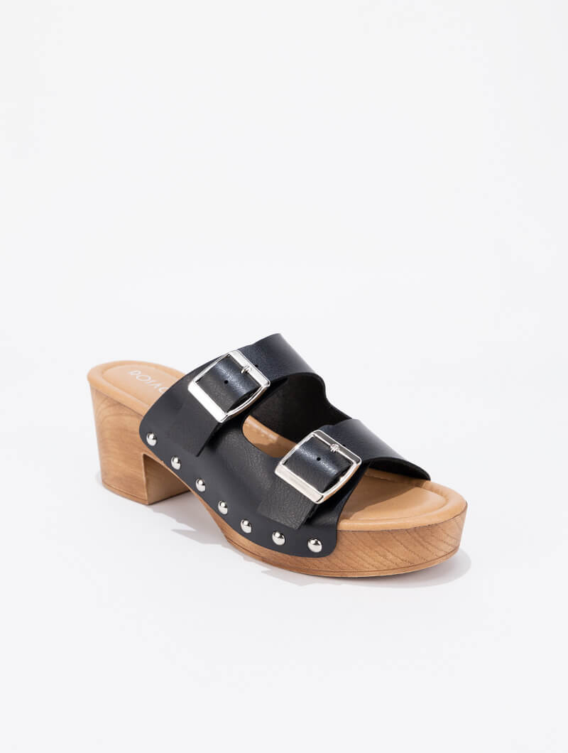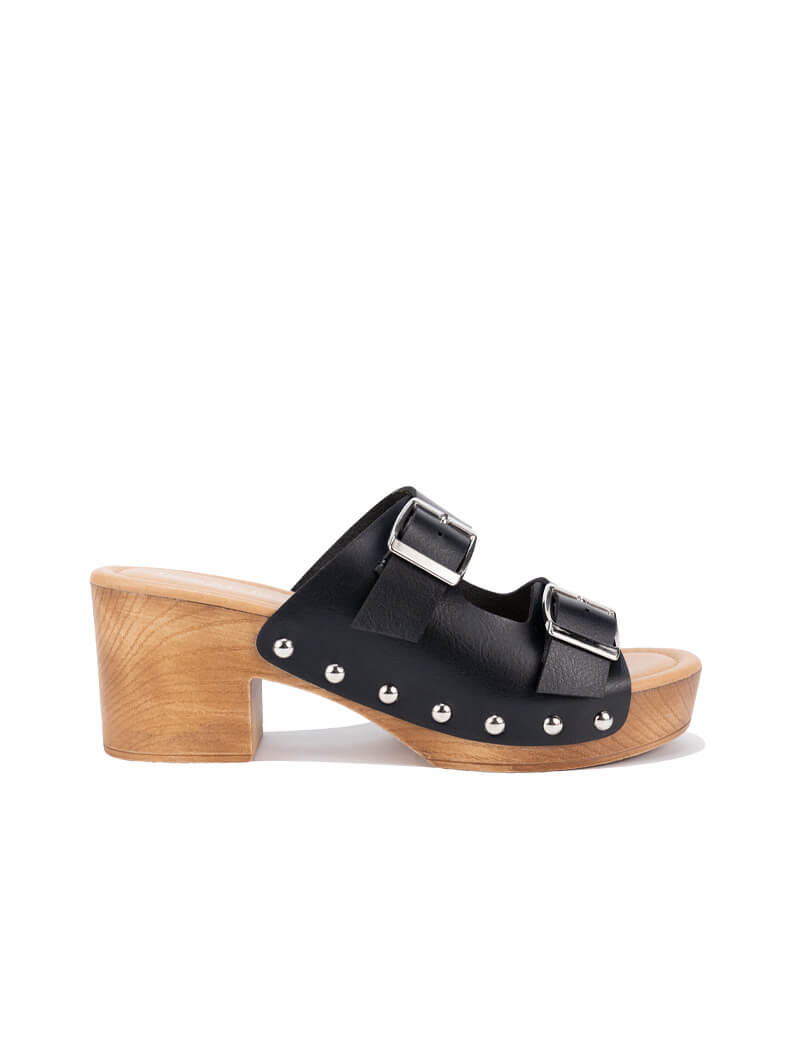 Apportez une touche chic et vintage à votre look avec ces mules. Dotées de deux grandes boucles métalliques réglables et de clous décoratifs sur les côtés, elles reposent sur un talon carré effet bois, stable et confortable. Parfaites pour un style décontracté mais élégant, en journée comme en soirée.