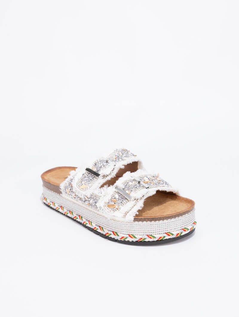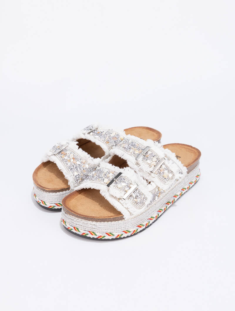 Apportez une touche d’éclat à vos tenues d’été avec ces mules ornées de strass scintillants. Dotées de deux larges brides ajustables avec boucles métalliques et finitions en tissu effiloché, elles combinent parfaitement confort et style. La semelle plateforme décorée de motifs tressés accentue leur allure artisanale et tendance.