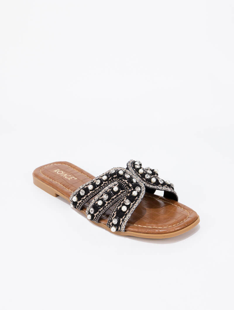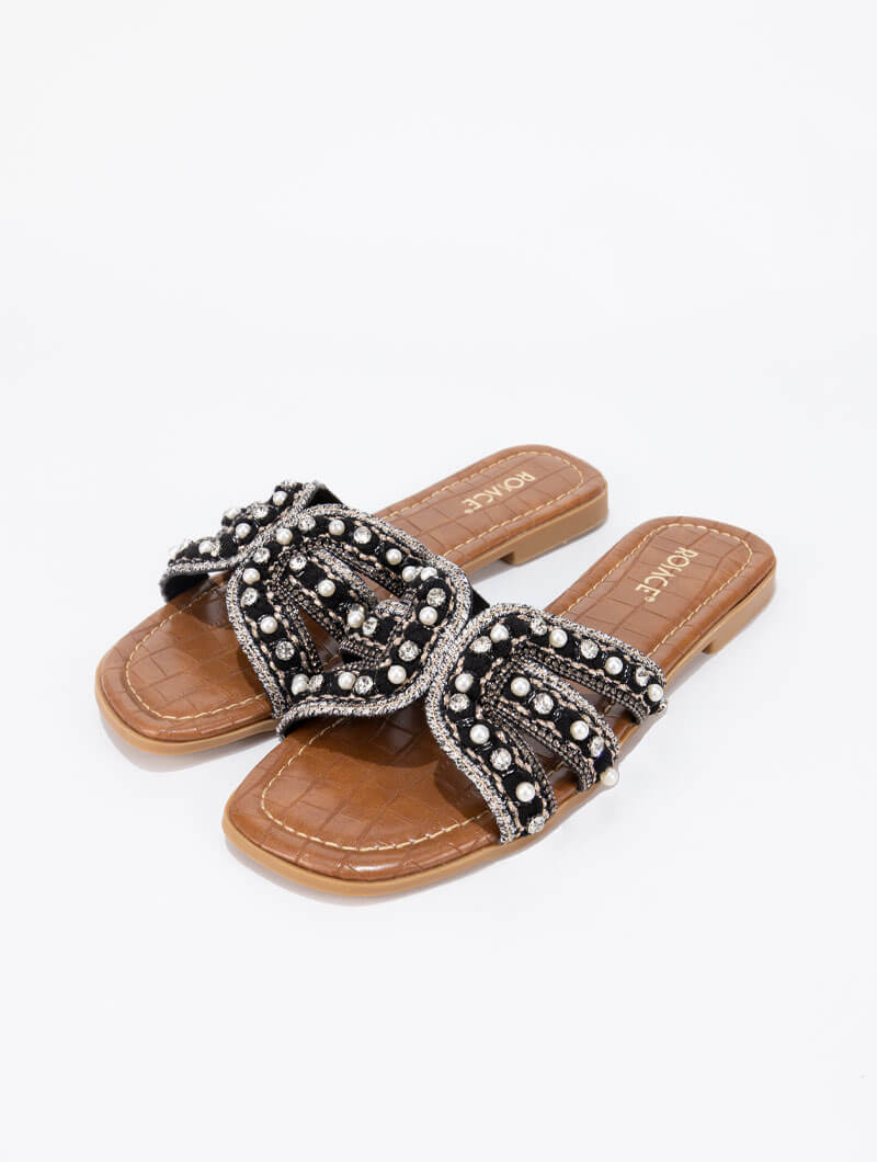 Ces mules plates ornées de strass apportent une touche glamour à toutes vos tenues estivales.