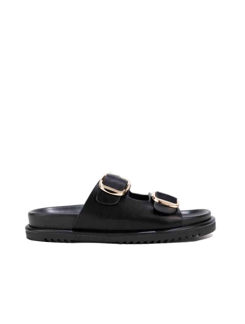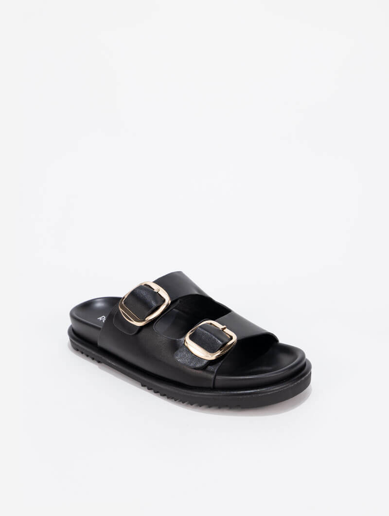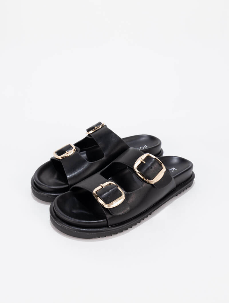 Ces mules plates à double bride se distinguent par leurs boucles décorées de strass scintillants. Alliant confort et praticité, elles apportent une note lumineuse et élégante à vos tenues de tous les jours.