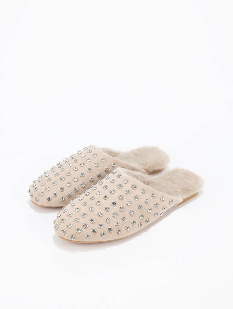 Ces mules plates à strass sont parfaites pour celles qui aiment allier confort et élégance. Leur texture douce et leur intérieur duveteux gardent les pieds au chaud, tandis que les strass apportent une note lumineuse et sophistiquée. Hauteur de la semelle: 1 CM